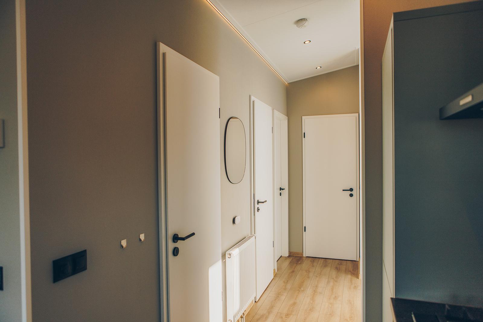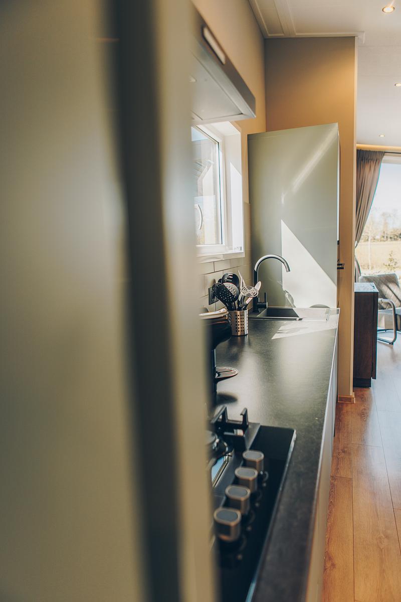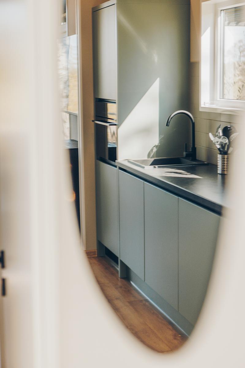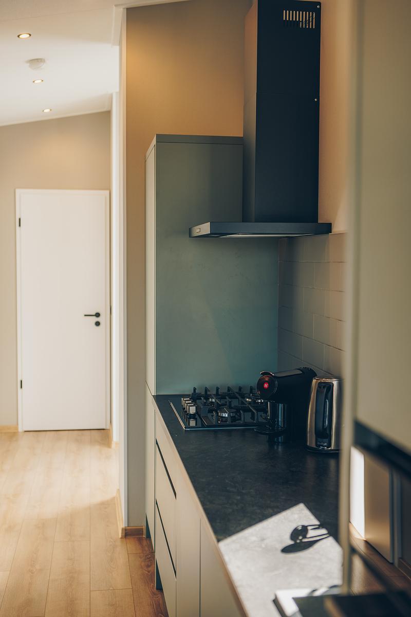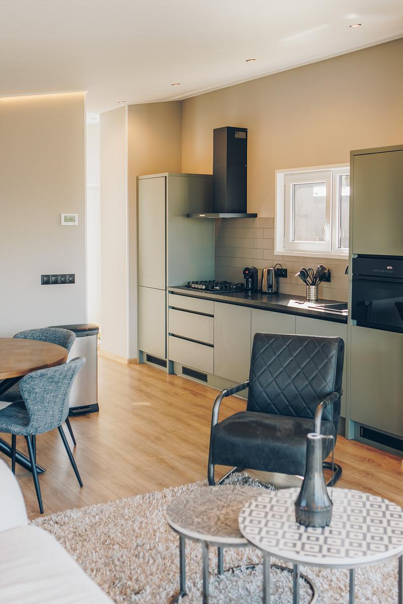 The living room and open kitchen together form a pleasant living space where you can easily spend the entire day. With two bedrooms and a modern bathroom, the home is fully equipped for a comfortable stay.
