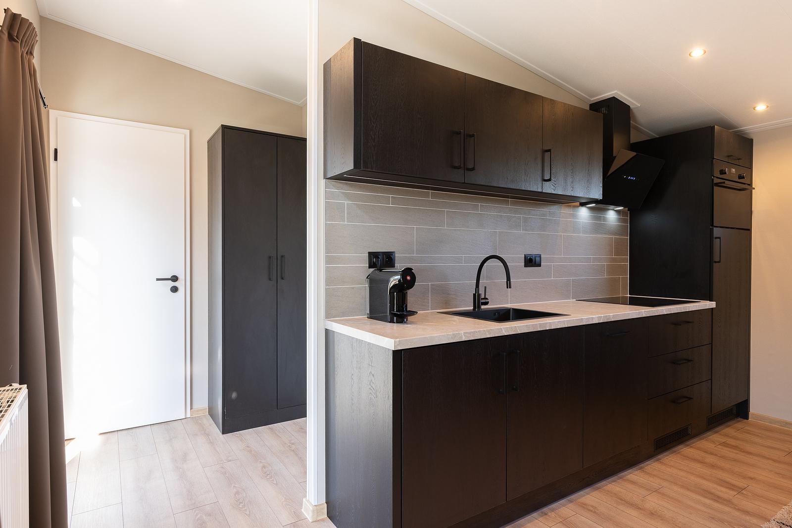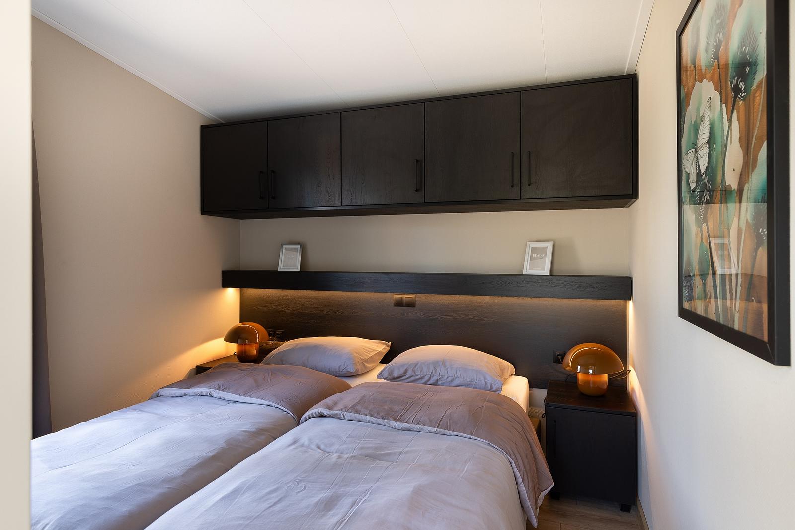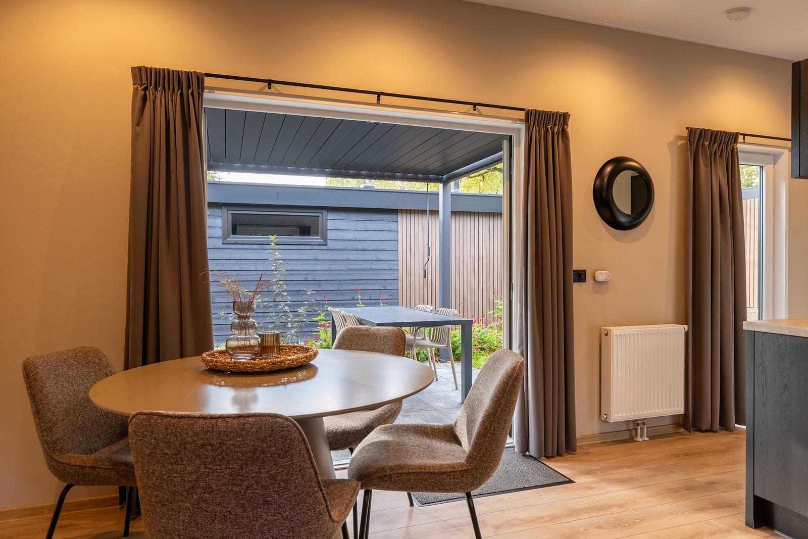Escape to nature and experience ultimate comfort in our stylish Renshorst holiday chalet. This modern 45 m² chalet accommodates 4 people and combines contemporary design with an open, airy atmosphere thanks to the impressive 3-metre-high ceiling in the living room. Enjoy a bright living area, a fully equipped kitchen, two comfortable bedrooms, and practical amenities such as a separate toilet.