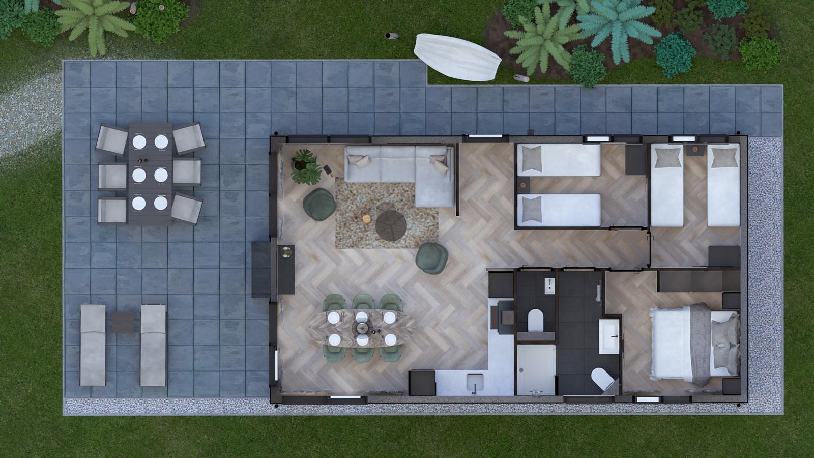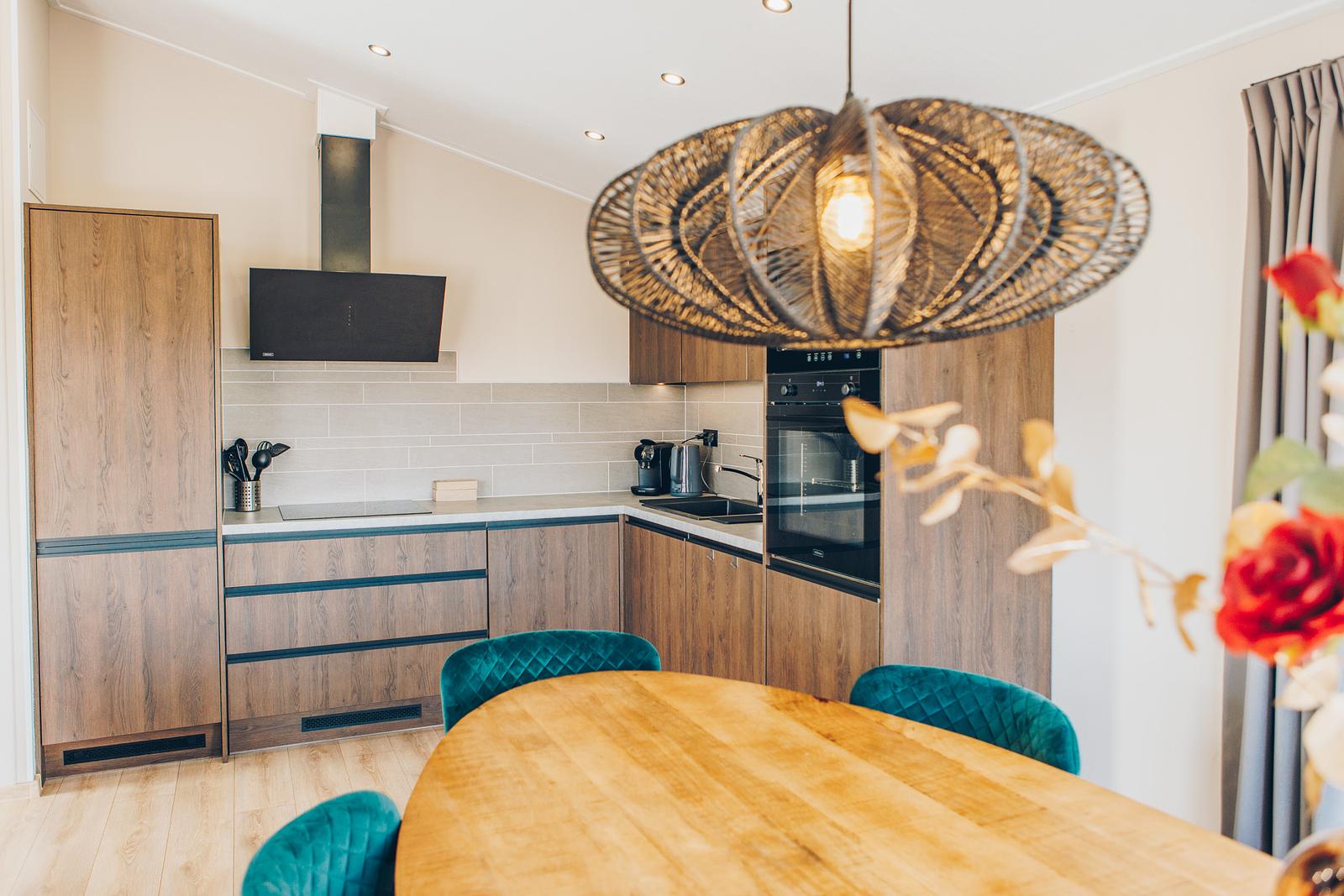 The spacious living room, bathed in natural light, invites you to enjoy long, cosy evenings and relaxed mornings with views of the greenery. Large windows create a beautiful panoramic feel, seamlessly blending indoor and outdoor living. In the modern corner kitchen, you can easily prepare an elaborate dinner, which you can enjoy together at the table or continue outside on the terrace as the sun slowly sets. Three comfortable bedrooms, a stylish bathroom, and an additional toilet provide plenty of space and privacy for a carefree stay.